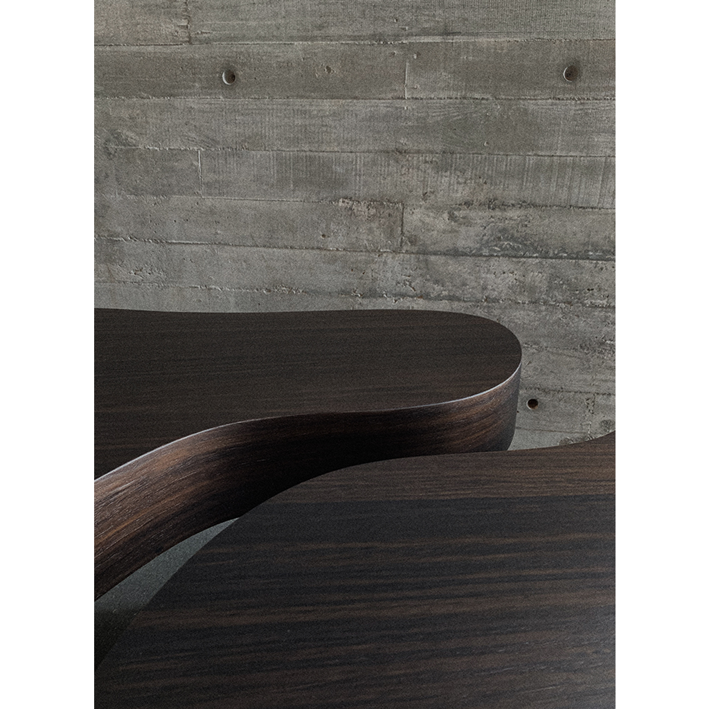 The wood is from the Eucalyptus tree and I embraced the perfect imperfections. It’s a hard and rough material salvaged raw from the rainforest. It offers, a beautiful deep and rich brown color with little linear marble light & dark undertones uncovered as you start to work the material. It took a lot of work to get rounded shapes out of this material, it’s rigid and unforgiving. Striations appear around the curves - and you learn to let things happen where the curves happen.